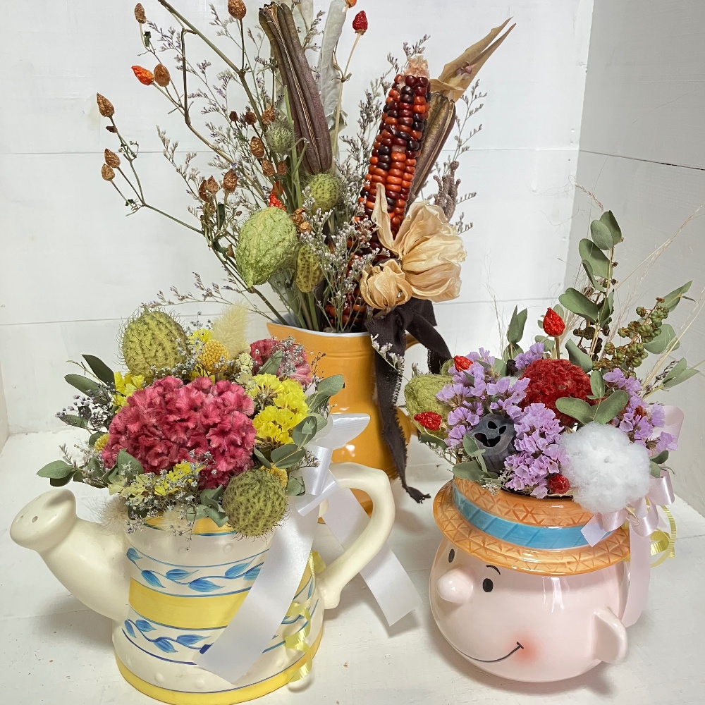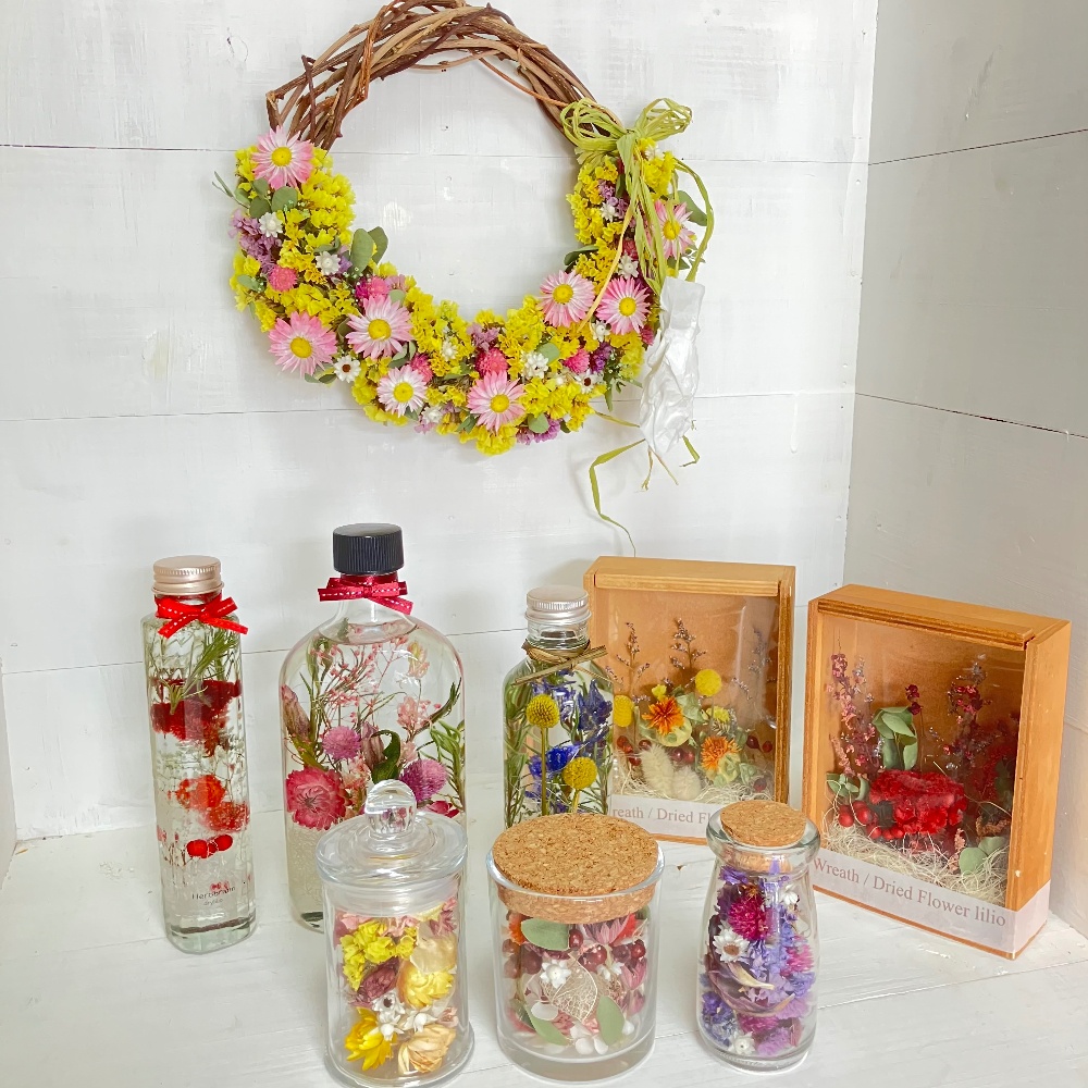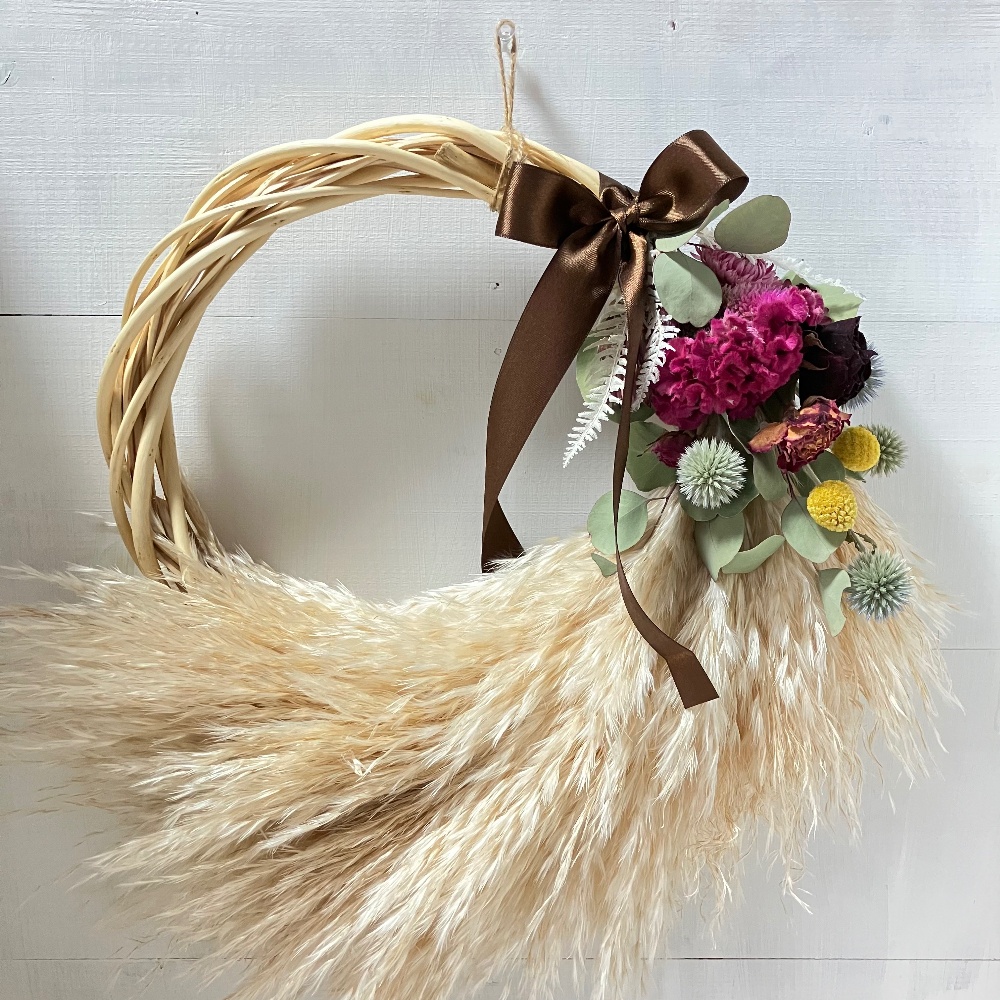 自家農園で育てた草花や野山の植物をドライフラワーにしています。花材として販売したり、リースやスワッグ、アレンジメントなどにして販売したりしています。